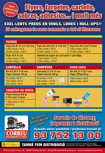 Treballem per tenir els millors preus del mercat oferint el màxim servei i qualitat. Per a això, ajustem els preus i realitzem ofertes de forma periòdica en targetes de visita, flyers, cartells, etc. Així com preus especials de publicació a la revista "El Correu del Maresme i La Selva".